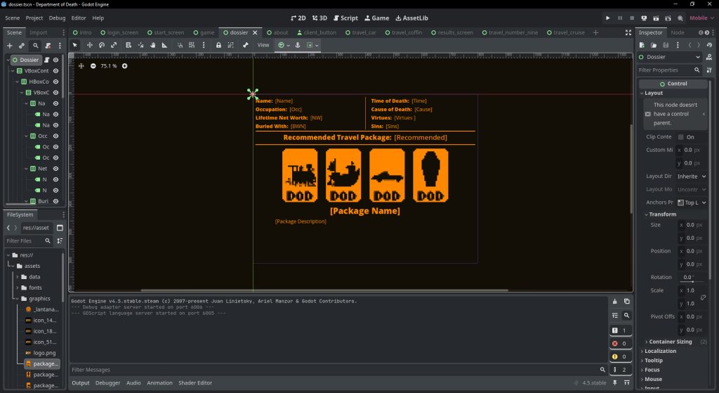 Every single node in this game is a Control node.* Labels give text-flavor to every Button. TextureRect nodes dance around slowly to add some style to your travel packages. RichTextLabels give deep control over the narrative, allowing for variation in the text styling. A MarginContainer controls the size of the game while HBox and VBox containers organize the layout. An overarching Color node displays the CRT shader. This gives the game its unique look, which then sits inside a Blender-rendered monitor on the itch.io page. While there’s a lot of GDScript controlling button presses, tweens, and variables, no other kinds of Nodes were used to bring this game to life.